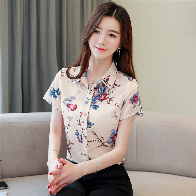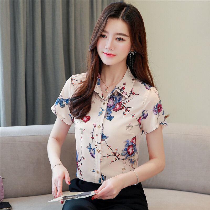 AFEG Korean style women's short-sleeved lapel printed temperament blouse for women