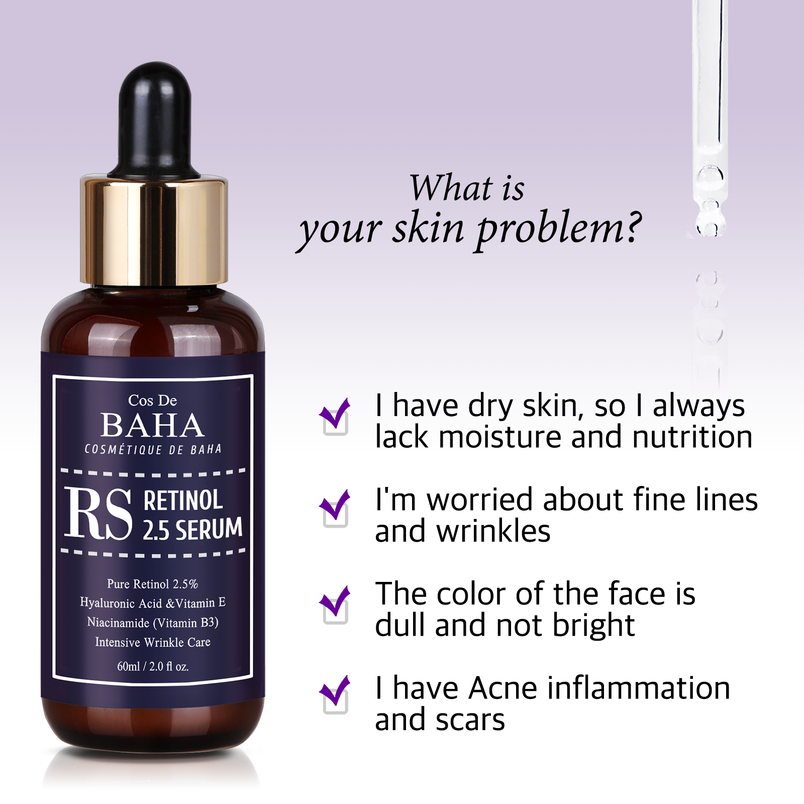 If you choose the Anti-Aging material that has been loved the most since the past, it reminds you of Retinol. Retinol is the purest form of vitamin A and has the effect of improving the elasticity of skin damaged by aging. It also helps improve acneand helps you change the color of your darkened skin. However, excessive use of Retinol can have unexpected side effects. So people were worried that they might get into trouble because of Retinol. Cos De BAHA is introducing the 2.5% Retinol Serum with a stable structure so that everyone can enjoy the full benefits of Retinol. Also, Niacinamide, a well-known material of late, is also being combined to provide a more comfortable experience of use. Now, make healthier skin with Cos De BAHA.amazon_RS60_04.png