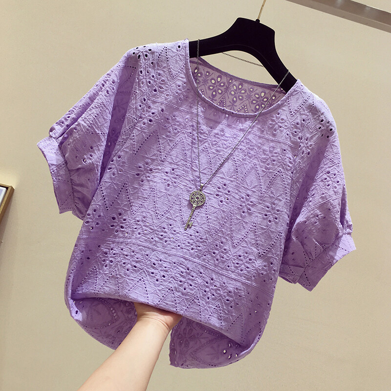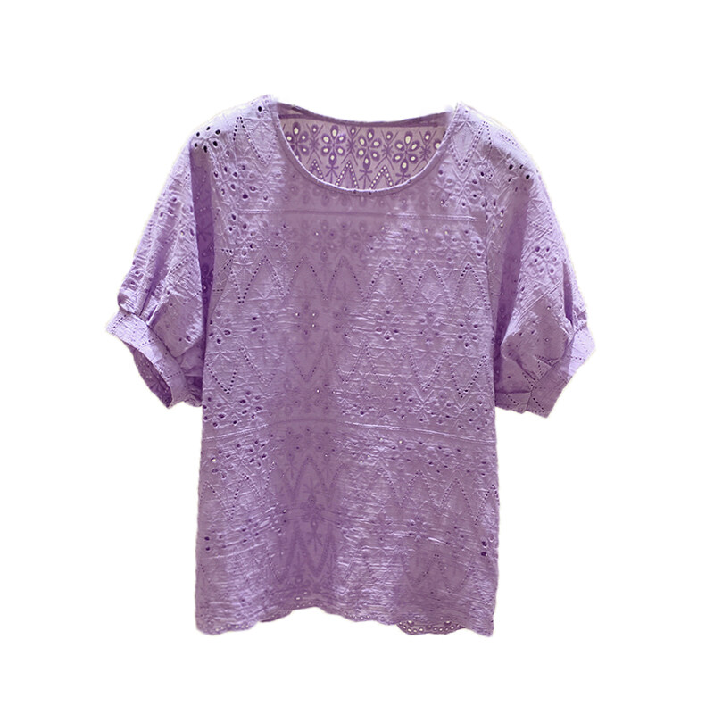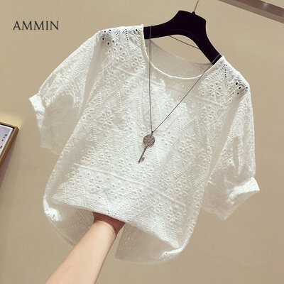 AMMIN Tops 2021 short-sleeved loose elegant sweet simple round neck fashion all-match blouse women's new embroidery flowery hollow puff sleeve lace shirt