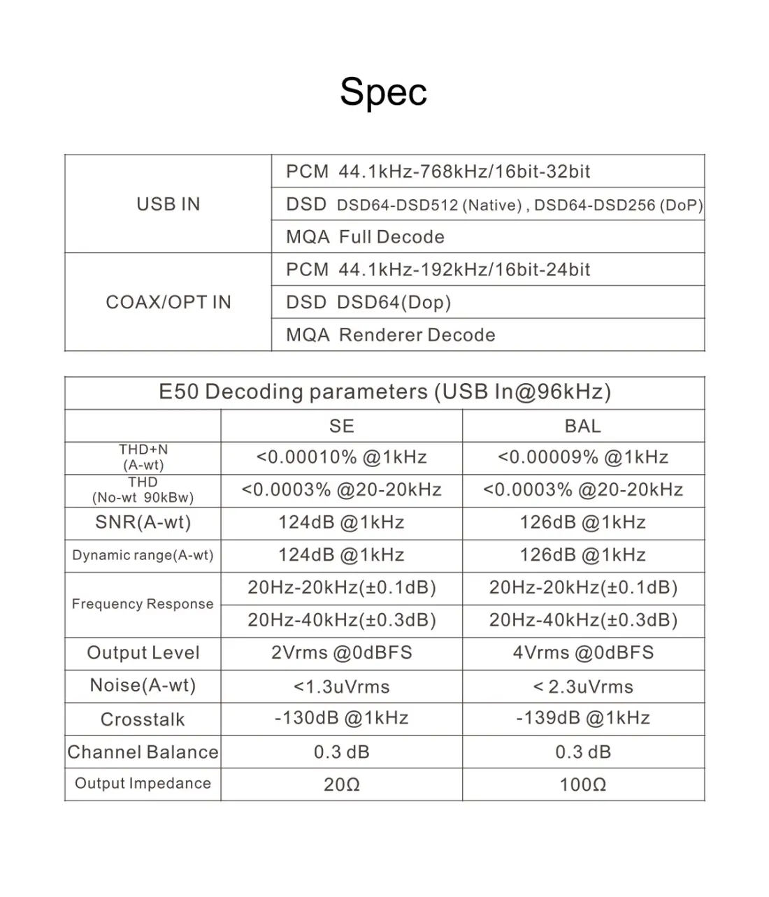 With the help of careful design and adjustment, E50 provides a distortion as low as 0.00009% and a dynamic range of 126dB, providing you with perfect sound quality.
