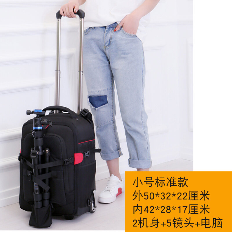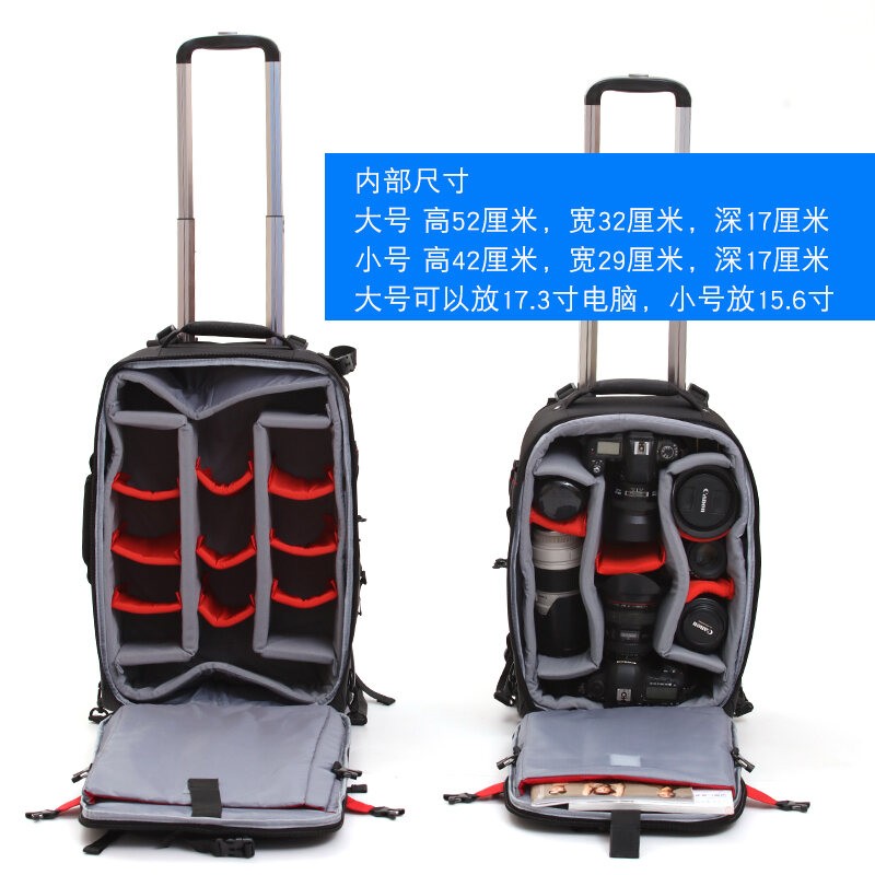 Trolley camera bag, small size, can hold SLR camera and telephoto lens, and 15.6-inch laptop. It can also be used for video cameras and can be pulled onto the plane.
