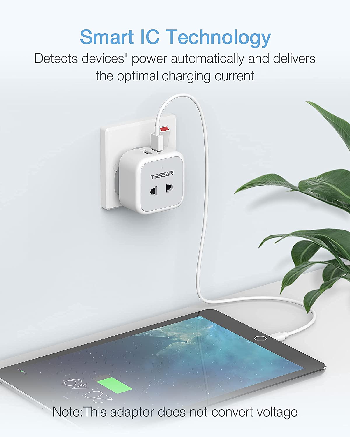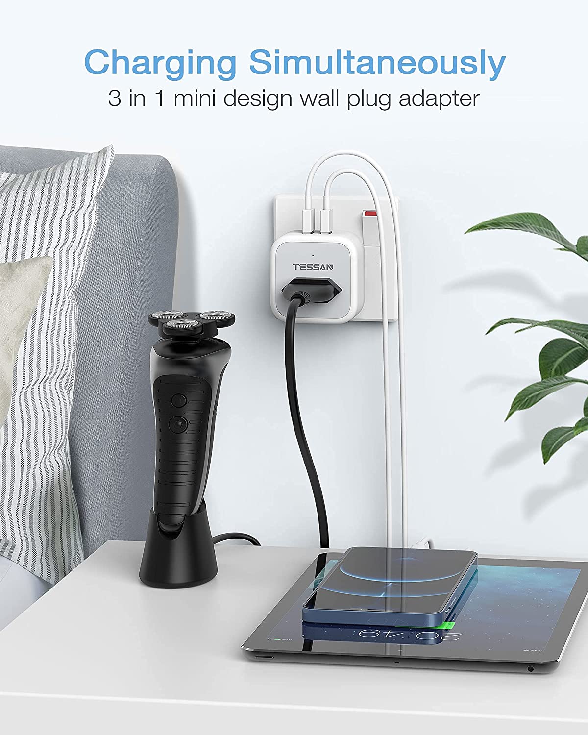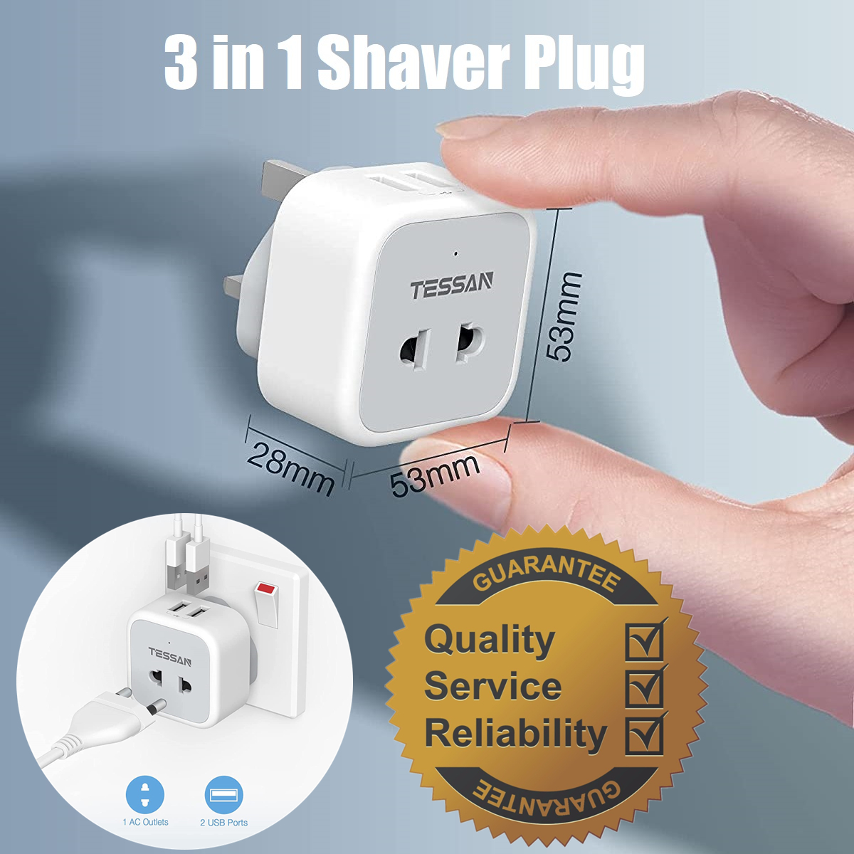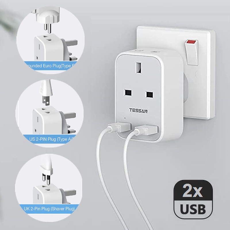 TESSAN 3-IN-1 Plug outlet accepts the standard UK 2 pin plug(shaver plug), European plug(Type C/E/F), and 2 pin US plug(Type A). You can use majority of two-pin devices with it.