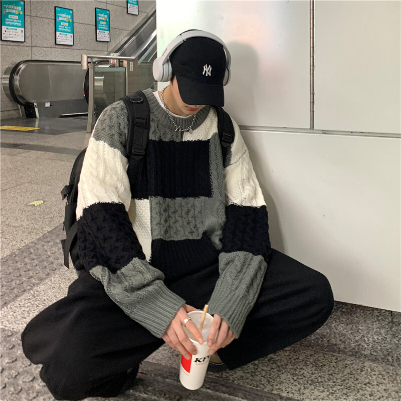 Contrasting Color round Neck Sweater Men's Autumn and Winter New Lazy Style Plaid All-Match Sweater Trendy Brand Bottoming Sweater