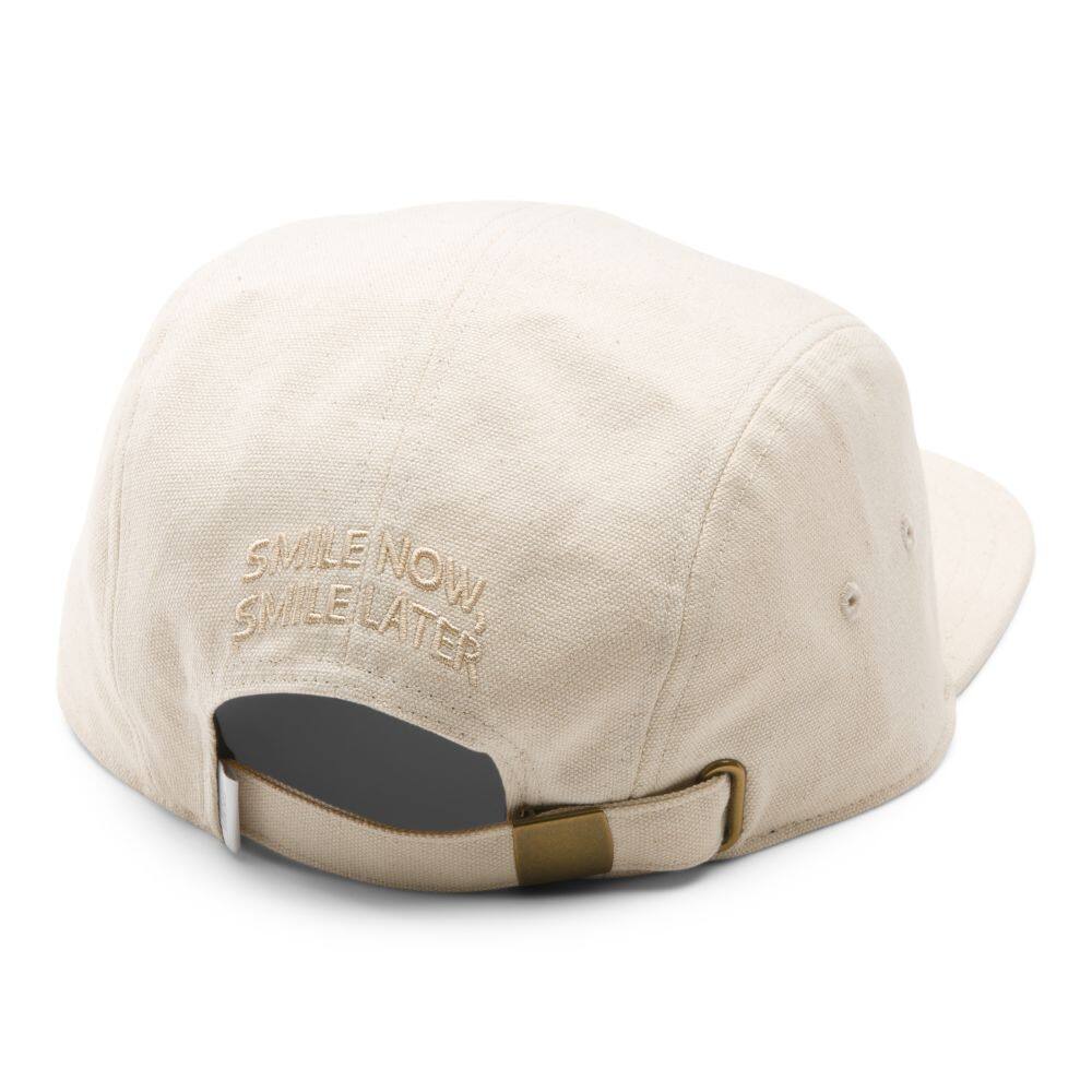 Featuring an elevated white aesthetic, the Just Smile Camper Hat is a 100% cotton 5-panel camper hat with a workwear-inspired woven logo label on the front panel and tonal embroidery at the back.