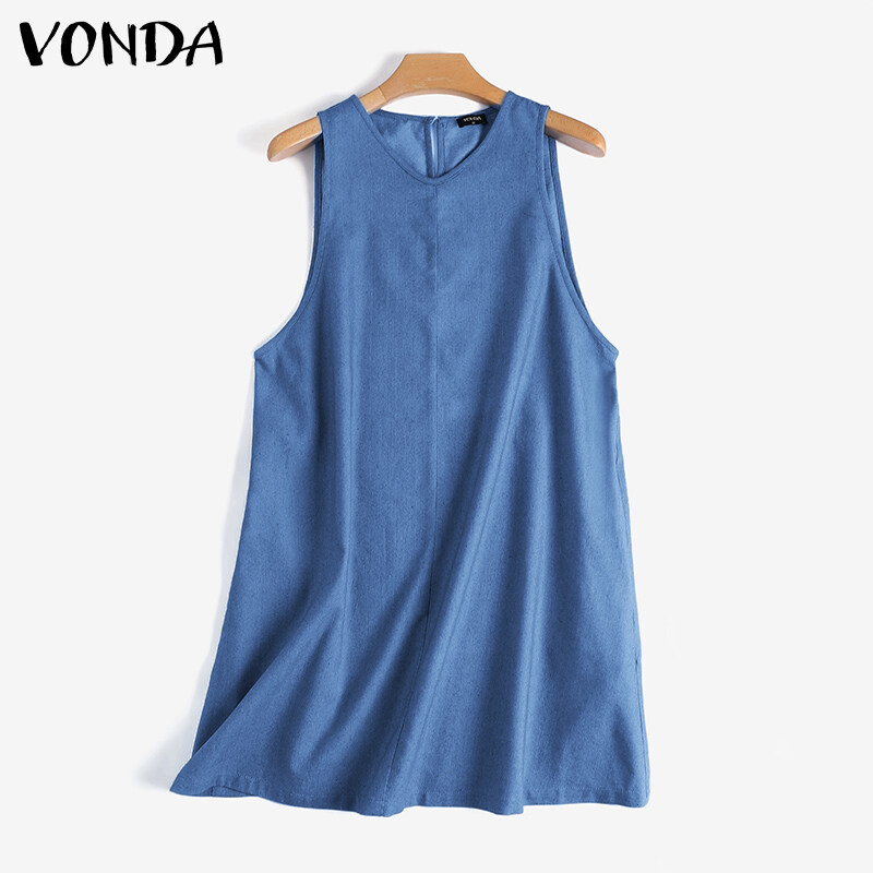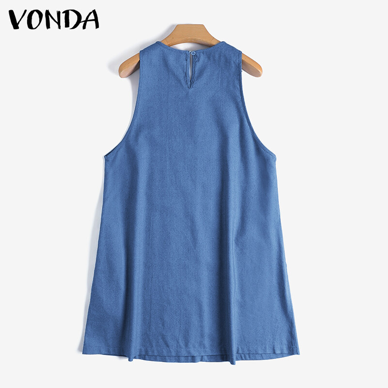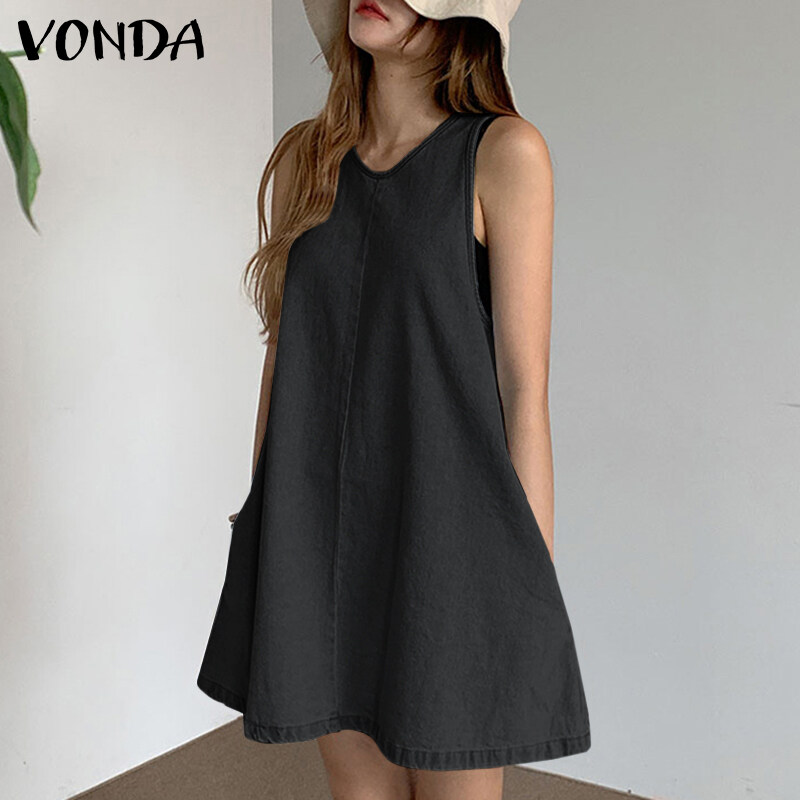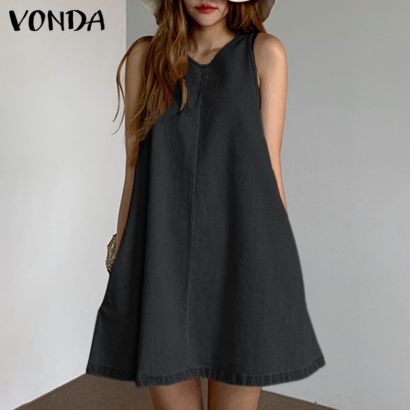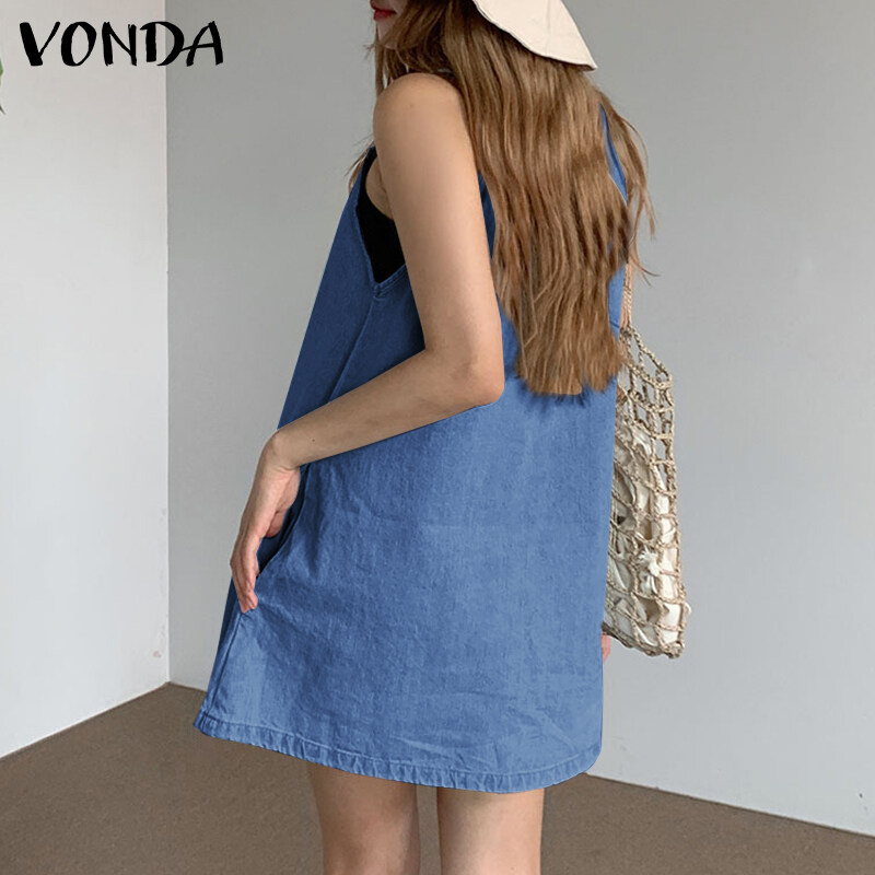 Forevercan VONDA Plus Size Women Casual Loose Sleeveless Holiday Mini Dresses Summer Fashion Denim Tank Dress