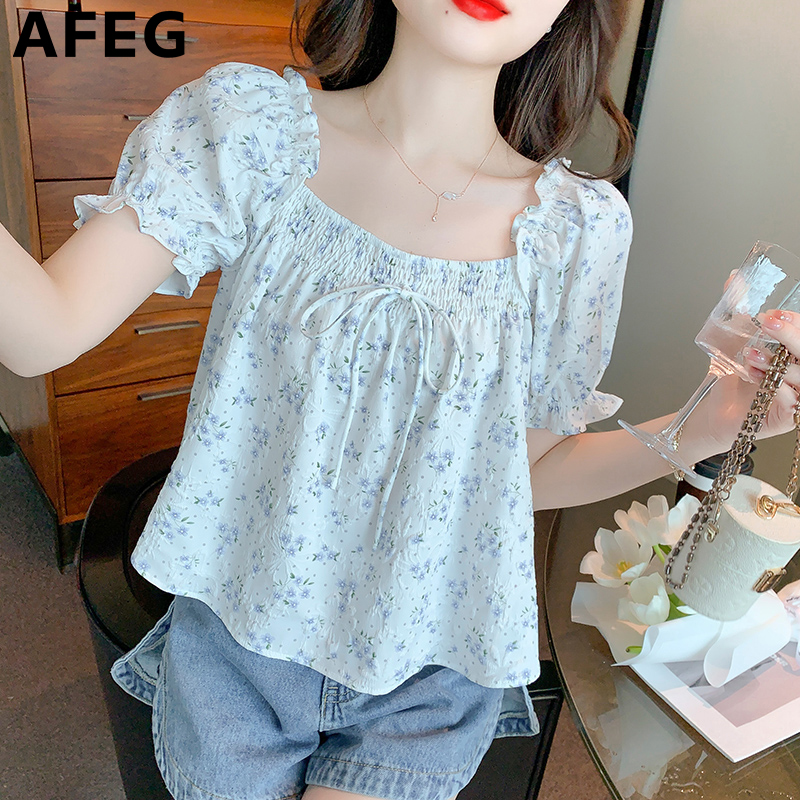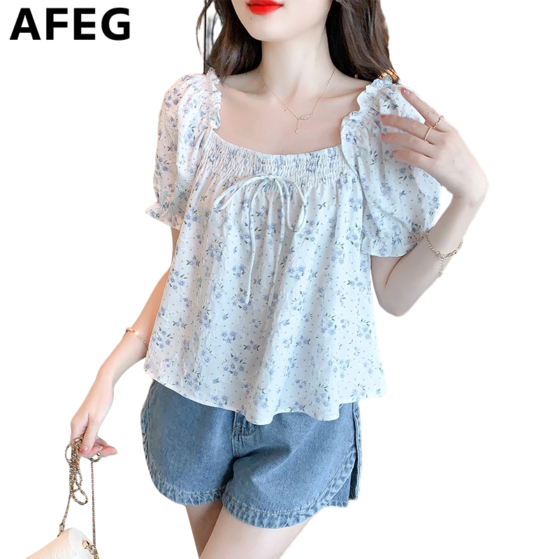AFEG new Korean style square neck bow fashion loose short sleeve blouse for women