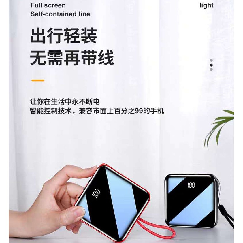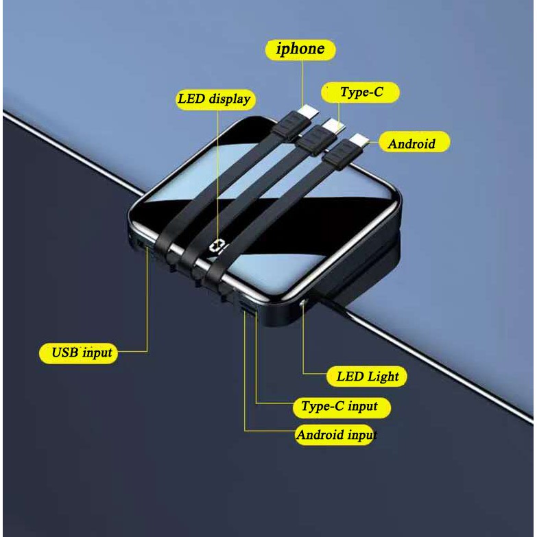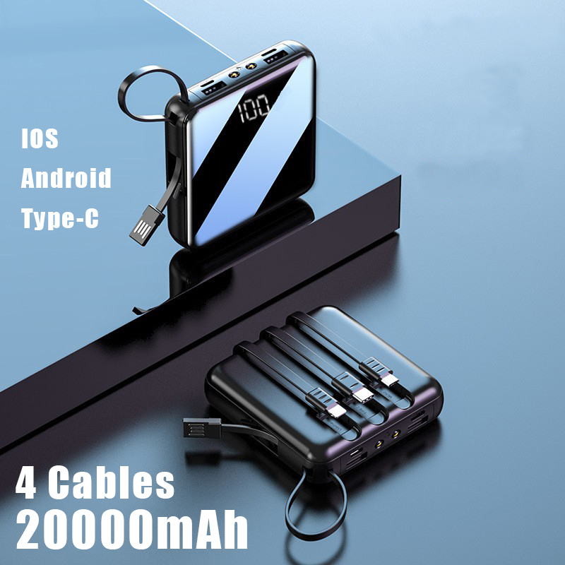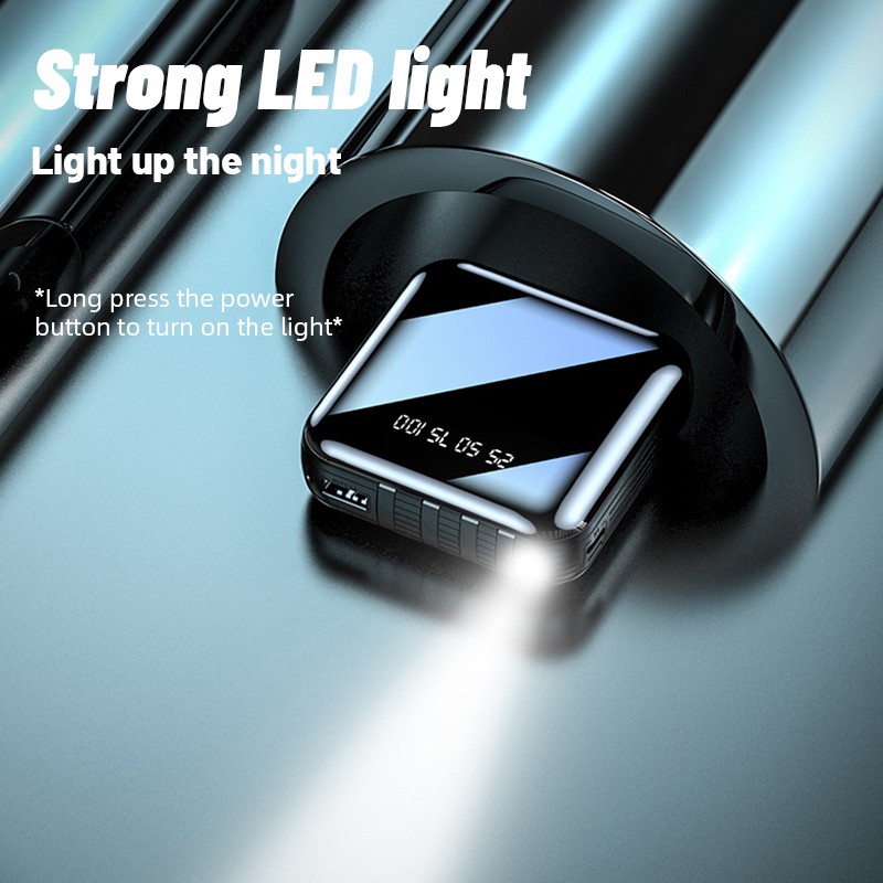The mini power bank is actually really mini, one is small and easy to carry, very mini, and the other is very good-looking, and you can be fascinated by its appearance. Of course, I know what everyone cares about most is its quality. Such a small body has a large capacity of 20000hAm. The key is that it is also equipped with this 2.1A efficient fast charge. Its little heart beats charging. Other power banks are 60% faster and can charge up to 5 electronic devices simultaneously. For everyone's convenience, we have installed four wires in its body, which is convenient for you to use on mobile phones and tablets without charging wires. When the electronic device is charging and needs to be charged, pull the power cord out of its body. After charging, you can put the power cord back into its body. This will make it easy for everyone to charge, and will not be stuffed into a school bag or bag. Messy, clean and tidy, it will be a pleasure to see. It is indeed the embodiment of high technology. Full mirror capacitive screen, LED display, how much power, two-way plug-in output, three-way plug-in output, at a glance. This project comes with its own cable output and has two LEDs on the surface to help you light up the road in the dark, easy to use and considerate.