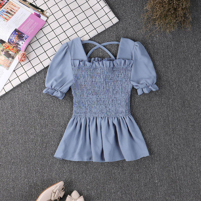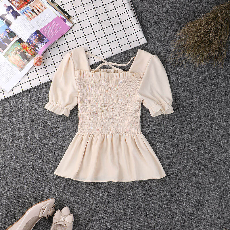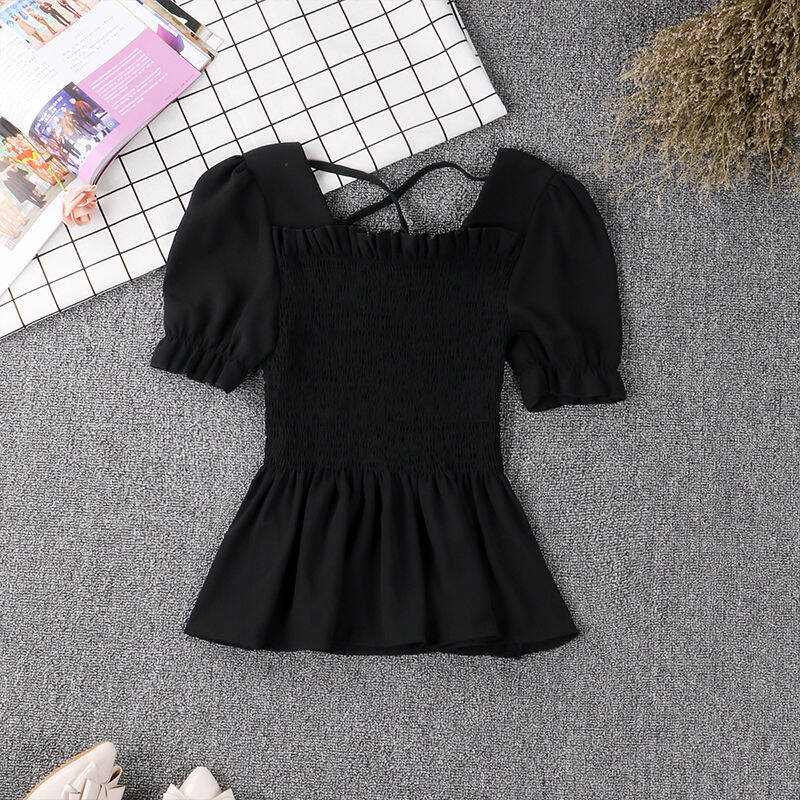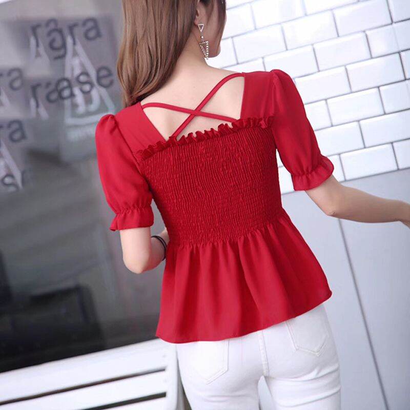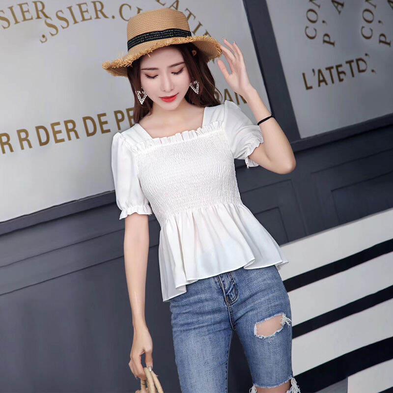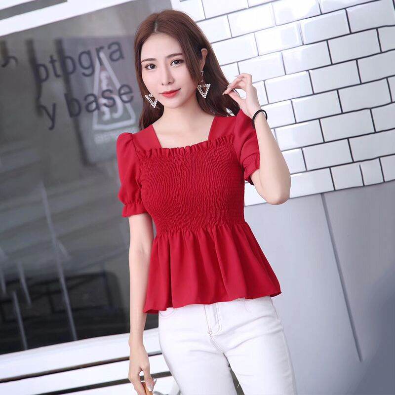 Wooden Ear Ruffle Skirt Swing Top 2019 Spring and Summer New Square Collar Puff Sleeve Waist Hugging Slimming Chiffon Shirt Women's Short Sleeve