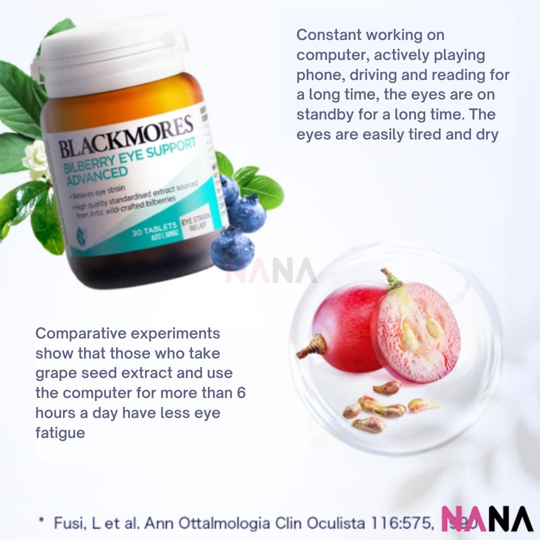 Blackmores Bilberry Eye Support contains a high quality standardised extract of wild European bilberries to support eye health. Each tablet is standardised to contain 16.2 mg of active anthocyanosides, the active ingredient providing antioxidant action.