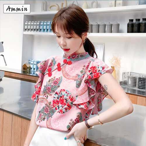 AMMIN summer new chiffon floral top female flying sleeves retro disc buckle ruffled shirt blouse