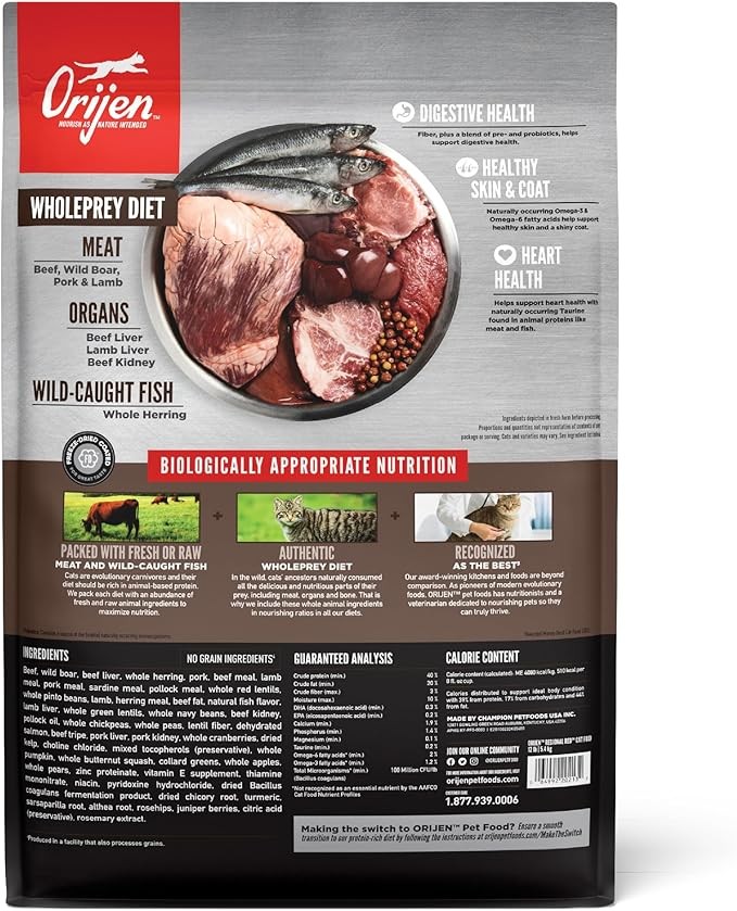 ORIJEN® Dry Cat Food, Grain Free, Premium, High Protein, Fresh & Raw Animal Ingredients, Six Fish, 12lb